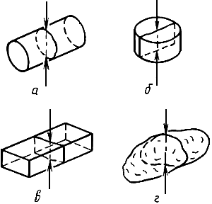 4.4.1.2. Приводя испытательную машину или пресс в действие, нагружают образец равномерно со скоростью 1-5 МПа/с до раскалывания сначала на бруски, затем по поперечным линиям на кубики полуправильной формы (две грани параллельные, шлифованные, а четыре грани образовались при раскалывании). Диски диаметром 40-60 мм раскалывают на четыре части.