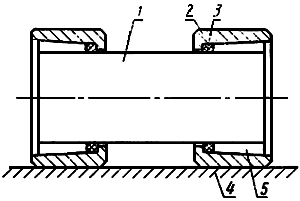 1 - образец; 2 - обойма; 3 - центрирующее кольцо; 4 - направляющая; 5 - скрепляющий материал