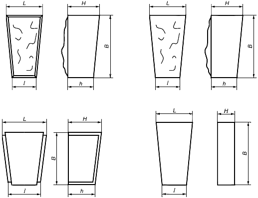 4.2.2 Прямоплоскостные толстомерные изделия должны изготовляться в пиленом и колотом исполнениях. К пиленым относят изделия, получаемые выпиливанием, к колотым - выкалыванием. Допускается изготовление колотых изделий с двумя-четырьмя пилеными гранями.
