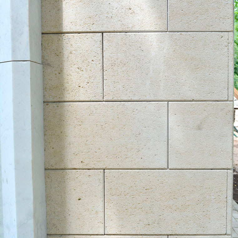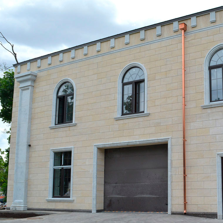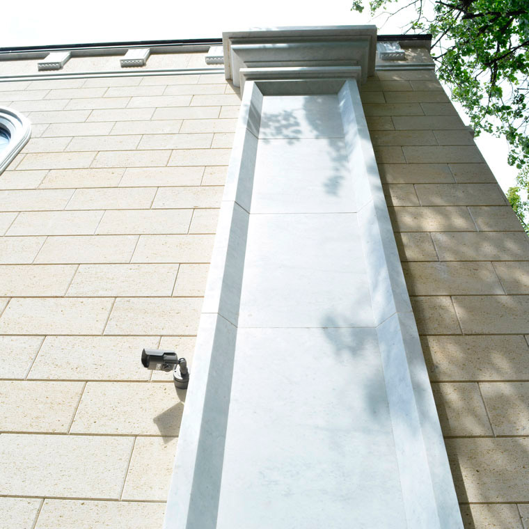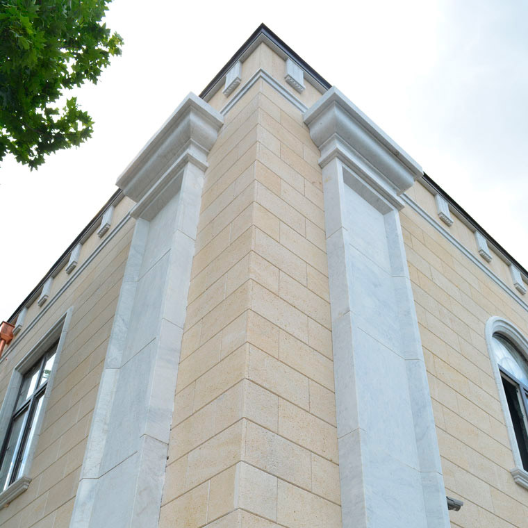 В рамках проекта были реализованы работы по облицовке фасада здания ракушечником с рустом по периметру и отделке цоколя гранитными плитами Леопард Скин. Также были изготовлены архитектурные детали из мрамора Коелга для обрамления оконных проемов и отливов. На фасаде были установлены мраморные декоративные элементы - триглифы.