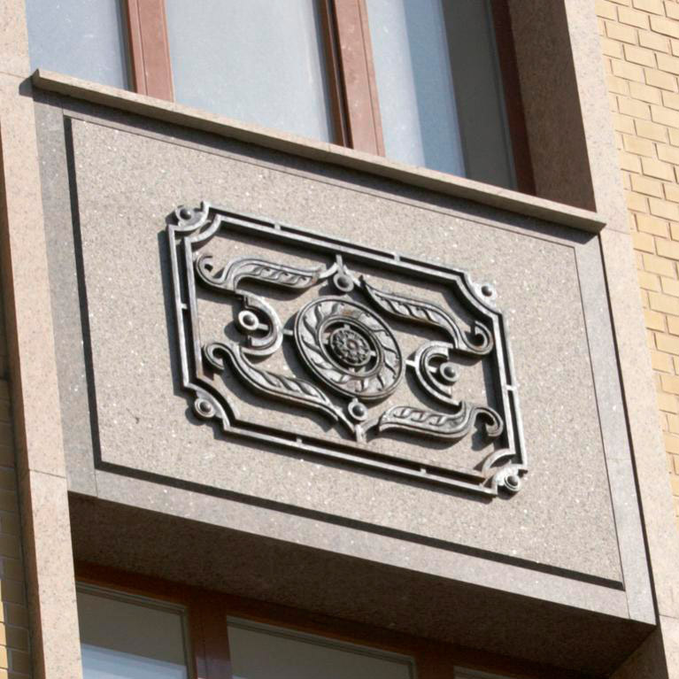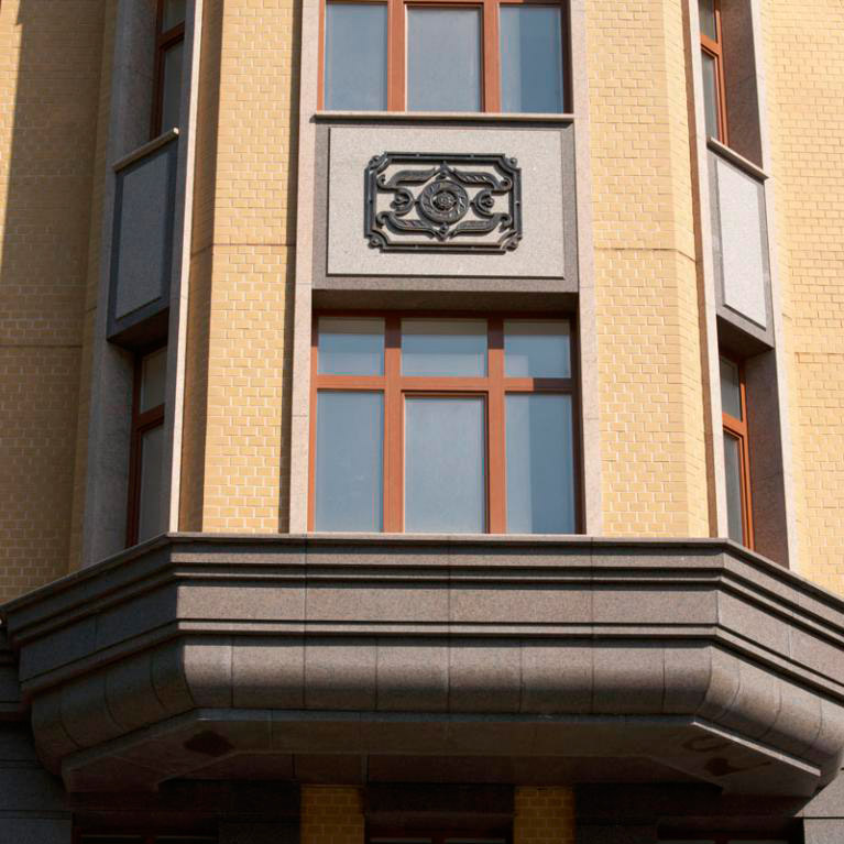 Дополнением к ампировскому стилю здания элитного дома в Знаменском переулке стало изготовление медальонов из гранита Джиалло Сицилия и их монтаж на фасад.