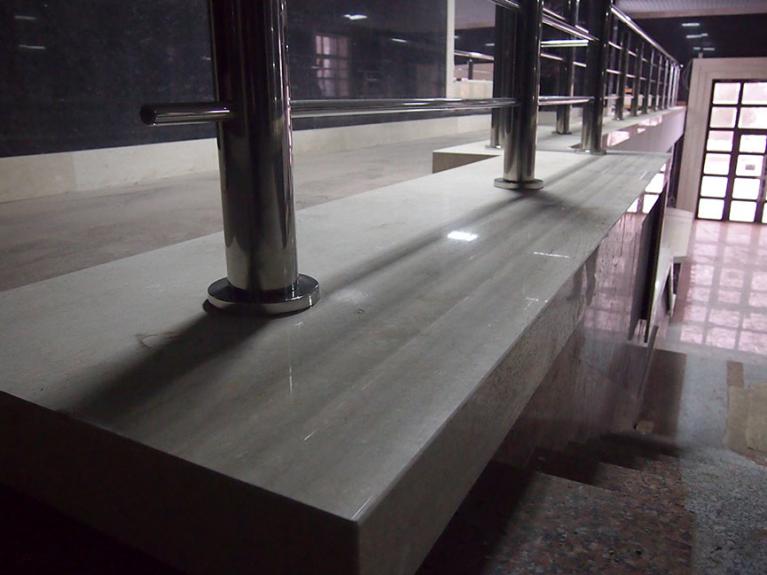 Лестничные парапеты, изготовленные из мрамора Лотус Кинг в классическом стиле, установлены в холле многоквартирного дома ЖК Азарово.