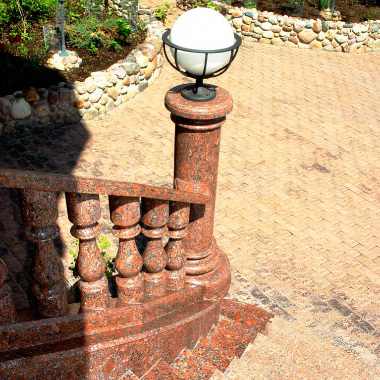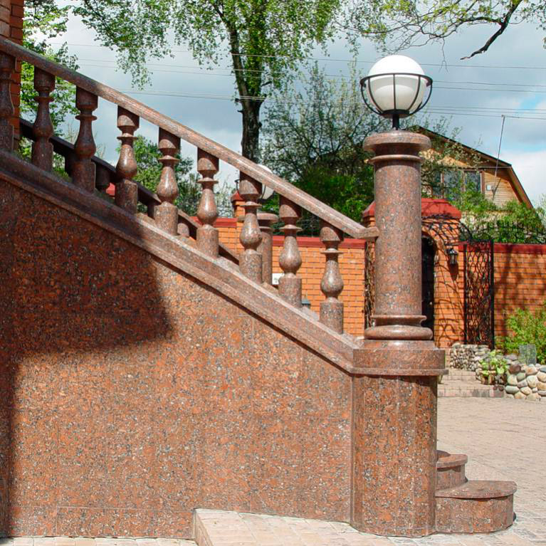 Перед дизайнерами и проектировщиками стояла задача сделать входную группу с балюстрадой в стиле классицизма. Лестница в составе крыльца с декоративными элементами в виде балюстрады и колонны были изготовлены из гранита Капустинский.