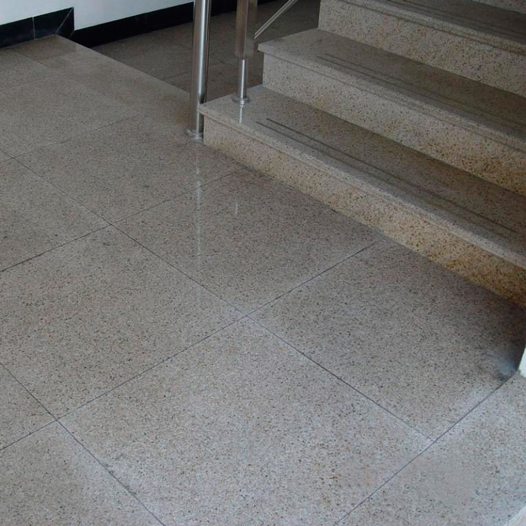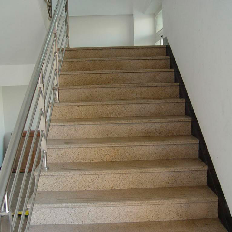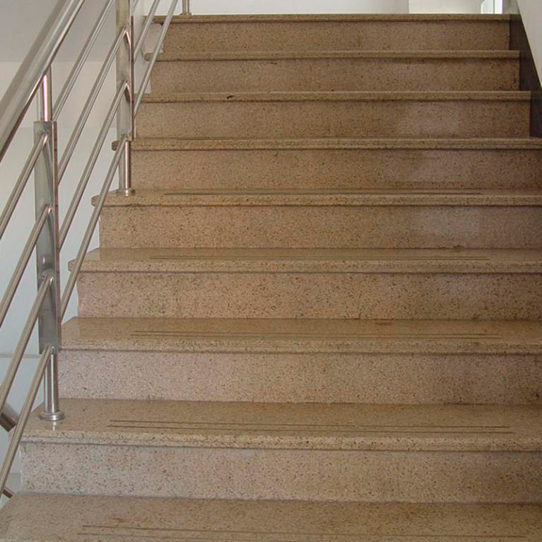 Лестница сделана из гранита теплых тонов Сансет Голд. Гранитная плитка стала продолжением общего каменного ансамбля в доме в облицовке площадок между лестничными пролетами.