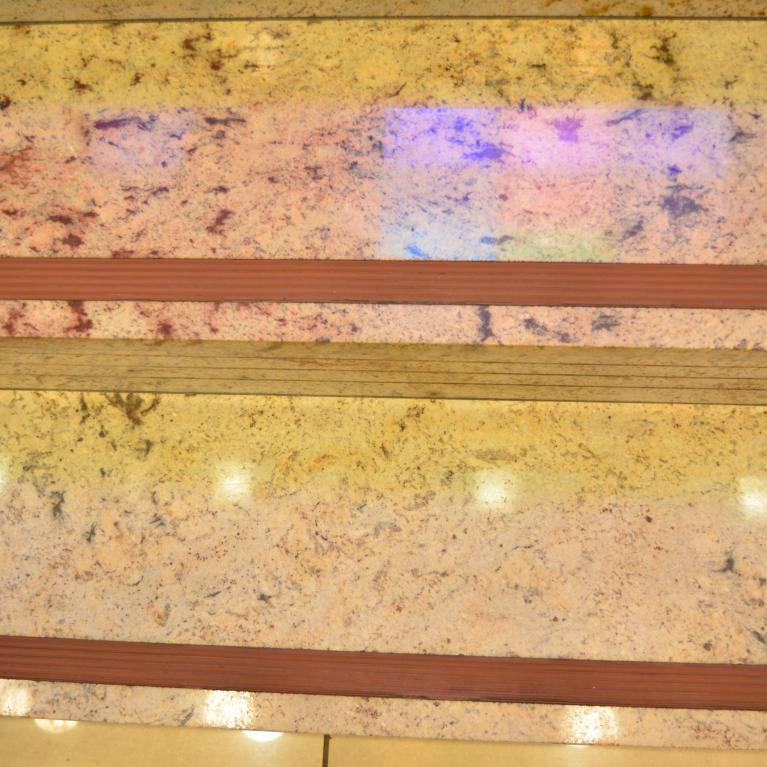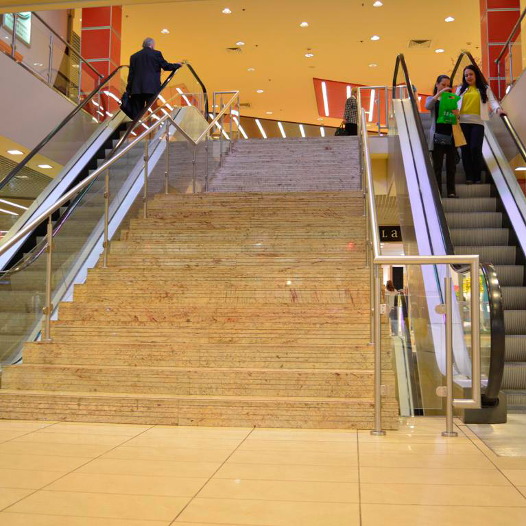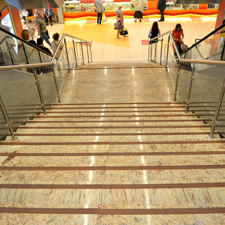 Прочные ступени были изготовлены из гранита породы Айвори Браун и установлены на лестничном марше в холле торгового центра.
